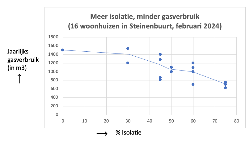 Als voorproefje hier alvast een grafiekje. Daarin kun je zien dat het gemiddelde jaarlijkse gasverbruik van een woning afneemt, naarmate er meer isolerende maatregelen zijn genomen. Daarvoor doe je het ook natuurlijk. We kunnen voorzichtig concluderen, dat woningen waar veel is geïsoleerd ongeveer de helft minder gas per jaar gebruiken. Er zit natuurlijk een grote spreiding in het gasverbuik per woning omdat het gasverbruik ook wordt bepaald door of je een hoekhuis of een hoekwoning hebt, hoe hoog je de thermostaat zet, hoeveel je thuisbent en hoeveel personen er wonen.